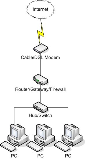 Scenario 3: PC -> Hub/switch -> Gateway device -> DSL or cable modem