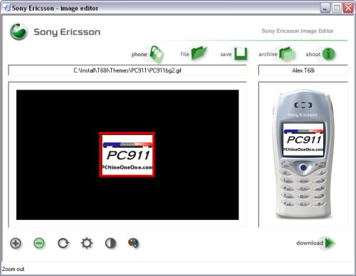 The Software: Image Editor http://www.sonyericsson.com/downloads/ImageEditor_1.5.1.exe Sony Ericsson Image Editor is a free program that allows you to crop, zoom, rotate, adjust color, contrast and brightness settings for existing images in Bitmap, GIF, JPEG, PCS, or TIF format. After editing, the finished images can be downloaded straight to the phone where they can be used as background pictures.