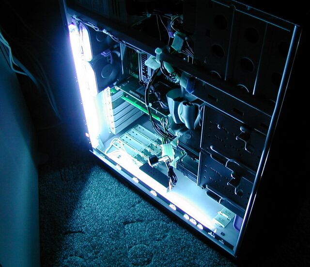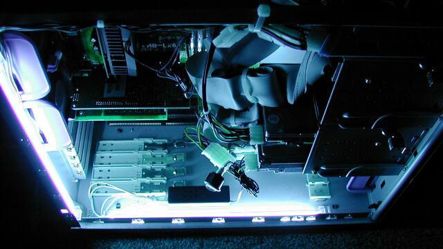 The first thing that catches your attention is the brightness of the tubes. The amount of light produced by this light kit is impressive, more illuminating power than other light kits I have seen. With two powerful tubes like these even a tall file server case can be nicely illuminated. To give you an idea how bright they are: These two pictures were taken in a completely dark room at night, without any light, without flash, without any special camera settings. Judge for yourself.