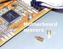 Now you know how all the parts will fit into place. Look through the hardware that came with the case. You should have a packet of small stand-off/spacer screws. These are usually brass, will thread into the case base plate and will support the system board. Screw them in place in the case and then set the system board down on them. You should now be able to use some small screws to fasten the system board in place. The screws will thread into the tops of the brass stand-off screws. Hopefully you got also some washers made from a non-conductive material, such as plastic, to use with the screws to absolutely eliminate the possibility of the metal head of the screw touching anything on the board it is not supposed to touch. If there are any screw holes left unsupported by the stand-off screws, look for plastic snap-in support grommets. These will snap into the remaining holes in the system board from underneath and help to support it. It is important to make sure the system board is well supported up, away from the metal case or it could short out.