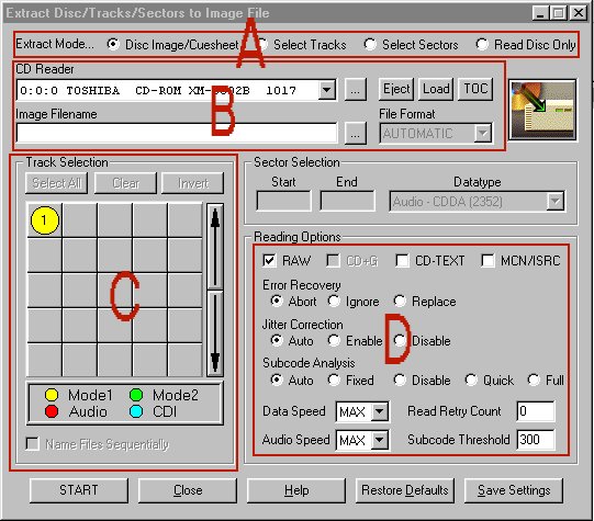 But don't worry, it's really not as bad as it looks. Let me just point out a few of the main features. If you look at the screen cap above, you will notice that the important features have been circled and labeled A, B, C, so on. First, direct your attention to the part of the screen cap labeled as A. This is where you can choose how the audio extraction will take place. You can extract an entire CD into an image file and automatically create a Cuesheet (I will get to that later). You can also do a standard extraction by selecting the tracks (best suited for Audio CD). If you want, you can even extract by specifying the precise sectors to read and copy. And the last option is to simply read the disc. For now, let's choose Select Tracks. With that selected, take a look at the part on the screen cap labeled B. This is where you can choose which CD-ROM drive to use for the extraction. This is also where you specify the output file for the extraction. To specify the output file (image filename as labeled), you need only to specify the first image filename and location. The rest will be named based on the track number and written to the same directory as the first. Now you are ready to choose the tracks you want to burn (look at section C of the screen cap). Simply click on the tracks you need. As you do that, the red circle representing the selected track will have a black circled put around it. Also notice the color codes for each of the tracks - Mode 1 (Data tracks), Mode 2 (Multimedia data), CDI and Audio. If you inserted an audio CD, you should only see red circles. You may have noticed that a check box labeled name tracks sequentially. Why didn't I have you check that before? The truth is, it's really not necessary. If it is unchecked, then the tracks will be labeled based on the track that's being copied. For example, if the first image filename you specified was 98Deg, then track 1 extracted would be named 98Deg01, track 4 would be named 98Deg04, so on. If name files sequentially were checked, then track 1 would be 98Deg01 and track 4 would be 98Deg02, assuming it was the second track copied. Before we click on start, let me call your attention to some of the advanced settings available. It is the section labeled D on the screen cap: