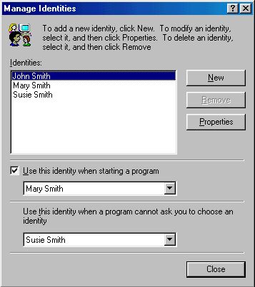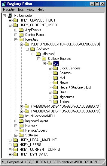 In addition to having a backup, we also recommend that you keep a current printout of your address book for reasons explained in the next section. Address Book -- Multiple Identities The preceding procedure also works for Outlook Express setups with multiple identities, but it's not as simple. When you create multiple identities, each user can see shared addresses (contacts), but each user will only see his personal contacts. However, everything is stored in one file, that is the filename.wab file. When you import the address book, the shared contacts folder will remain the same, but each identity's (user's) unique contacts will be merged. To help sort it out before exporting, each user should print out his/her unique address book, then the unwanted contacts can be easily deleted after the import. To prevent the merged contacts after a import, Windows can be set up with profiles and passwords so that each user must sign on to Windows. In that case, each user will have his/her own unique address book. However, since using Windows and Outlook Express is an everyday event and importing the address book is probably a rare event, just keep in mind that the address books will merge and not bother with Profiles/Passwords. Message Rules, Signatures, and OE Settings WARNING: This section involves editing the registry. Always back up your registry before modifying it. More items you probably want to back up are message rules, signatures, and OE settings. You can save them all in one step, including customized toolbars, by exporting a few registry keys!