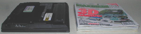 Weight and Size The X20 is a very compact notebook. Look at the picture below to get an idea how much. It is about the same size as 4 issues of MaximumPC stacked on top of each other. Its small size and light weight is one of the first things you'll notice when taking it out of the box. It is easily carried around with one hand, and does not make your legs go numb after an extended period of "laptop time".