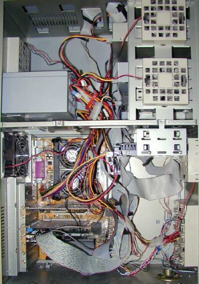 This was the setup of my main workstation in the Addtronics 7896A full tower case. As you can see it was pretty messy (though I've seen worse - a lot worse). Cables everywhere, SCSI and IDE cables blocking airflow, power cables close to fans, really not the best arrangement. Let's move on to the "after" picture.