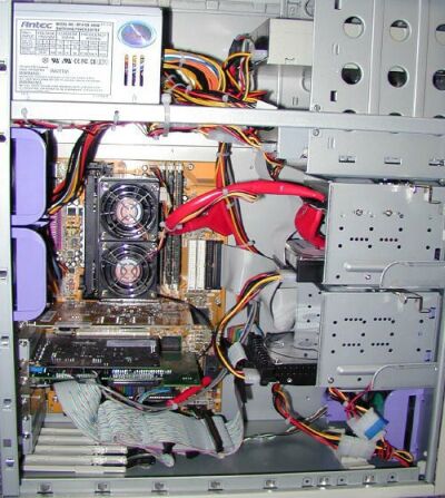 This is the exact same setup in the Antec SX1040 tower case, which is actually slightly less roomy than the 7896A. Now look at the difference. I admittedly went a little crazy with the zip ties to get the power cables bundled together and out of the way. But the rounded cables made it so much easier to clean up the cable mess. You barely notice the IDE, SCSI, and floppy cables anymore now that they've been replaced with rounded cables and zip-tied together. Now compare the two pictures again: Which setup would you rather work on? Not a tough choice, is it? Conclusion Pros:
